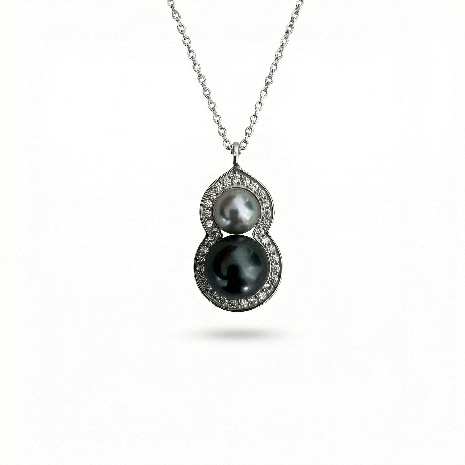 Crafted with one deep-toned Tahitian sea pearl and one luminous Akoya pearl, this gourd pendant necklace celebrates the harmony of contrast. The rich, dark glow of Tahitian pearl meets the refined brilliance of Akoya pearl, creating a balanced silhouette inspired by the timeless gourd form — a symbol of fortune and unity.